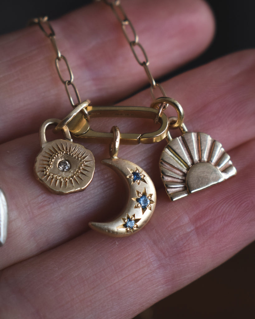 Hinged Charm Connector! Now available by pre-order. Machined from solid 14k yellow gold. I've been wearing mine consistently for over two years. It's amazing for curating a charm jumble and depending on how you style it, enables the charms to be spaced apart. Choose the charm connector only or pair it with open-ended paperclip chain, which has a 4mm jump ring at each end to easily slip through any of my handcrafted charm bails, and to hang beautifully from the connector. Endless versatility with this super fun essential.