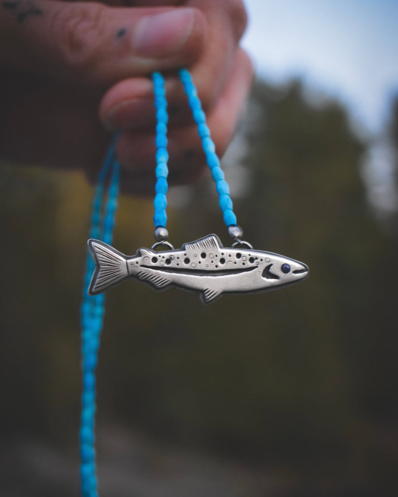 The latest edit on my Brookie series - a hand-fabricated (from scratch!) trout, with hand-pierced and hand-engraved details, and a tiny 1.5mm blue sapphire eye :) I've paired it with super vibrant, high grade, ethically sourced, artisan cut turquoise beads. Measures approx 19.25 inches from end to end, finished with a hand-forged hook clasp.