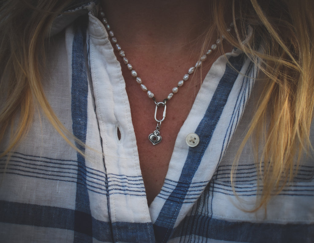 Nothing says autumn like the earthy smell of a freshly harvested beet! I love these little veggies - good for the heart on all the levels. Anyone else remember the book Jitterbug Perfume by Tom Robbins? I hand-fabricated this lmost diminutive of heart roots from scratch - melting down old silver jewelry and scraps and rolling the ingot. For good measure, I bead set a 3mm deep red Idaho garnet. Oxidized satin finish for an old world feel. The charm hangs from a baby carabiner that screws open and closed, and connects a strand of heavily textured, natural, river pearls that I hand-knotted onto brown silk. Each pearl masures approx. 4mm, and the strand measures approx 18 inches from end to end. You can also wear the pearls on their own, without the charm, by removing it from the carabiner, or add on other charms from your collection. Lots of possibilities with this setup!