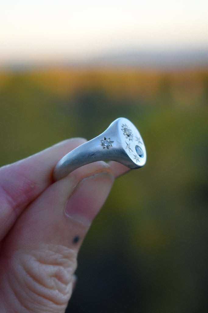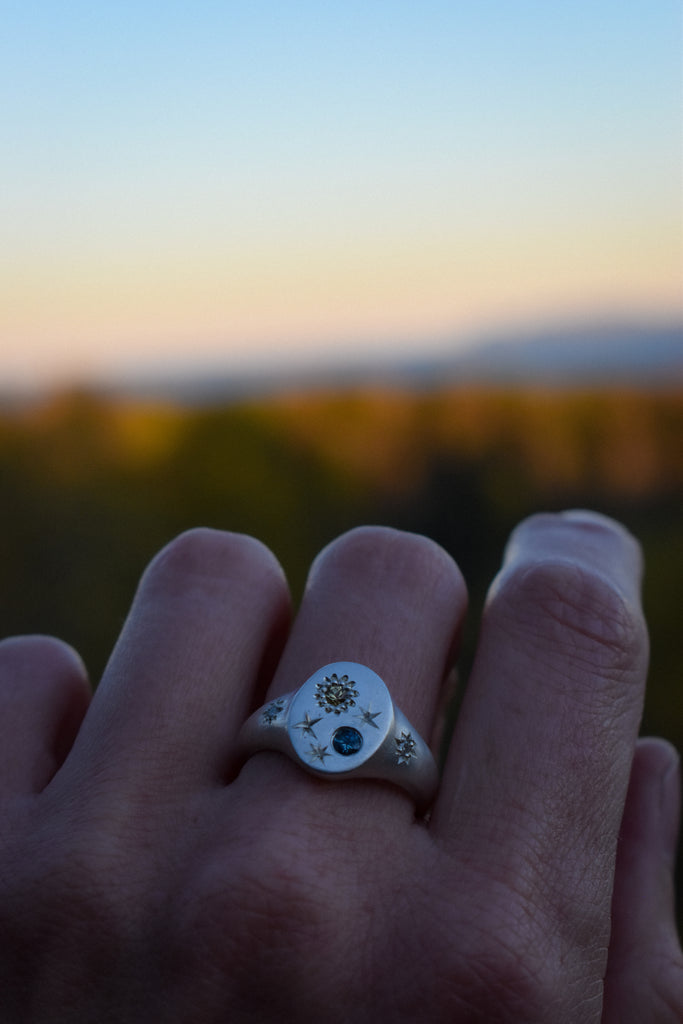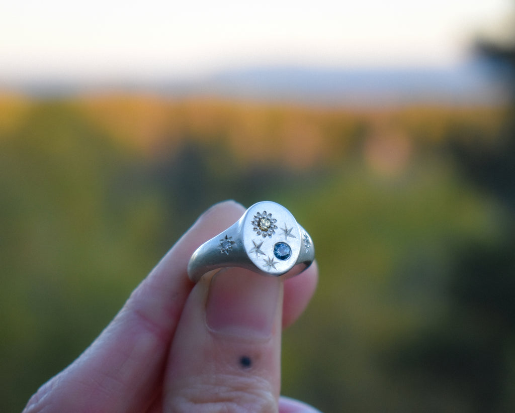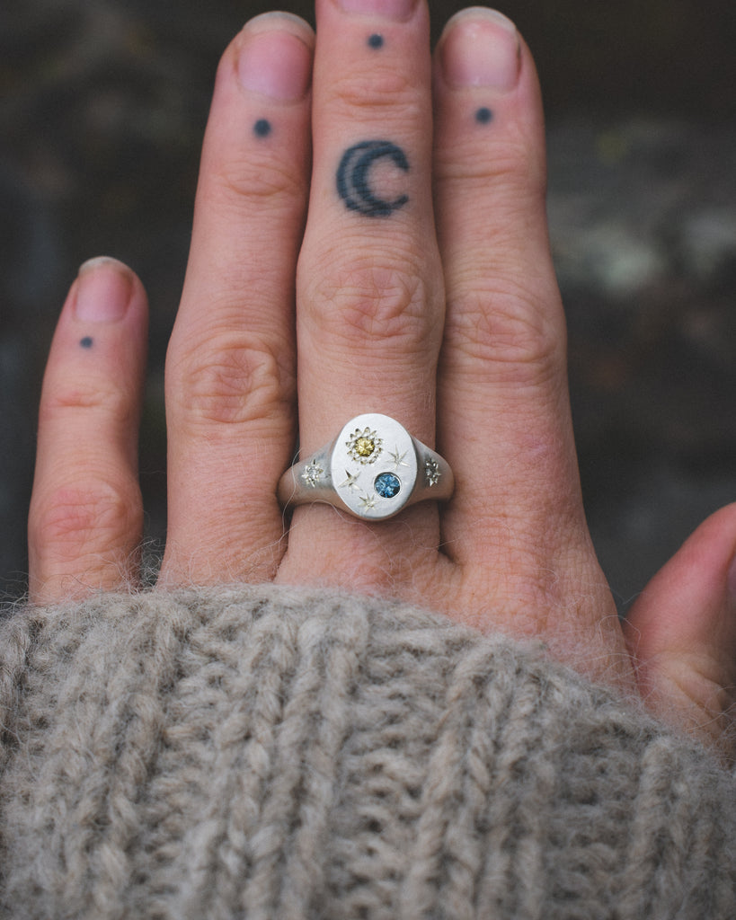 Heavenly Bodies Signet - a meditation on cosmic energies. A beautifully weighty signet with an oval face, which I hand-carved and lost wax cast. I created the sun by bead-setting a 3mm yellow Sri Lankan sapphire. The moon is symbolized by a 3mm flush set blue Montana sapphire. Reclaimed white Canadian diamonds are star set into each shoulder of the signet. Finished with hand-engraved stars!