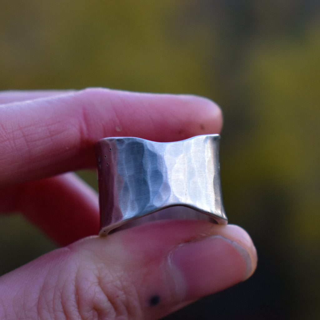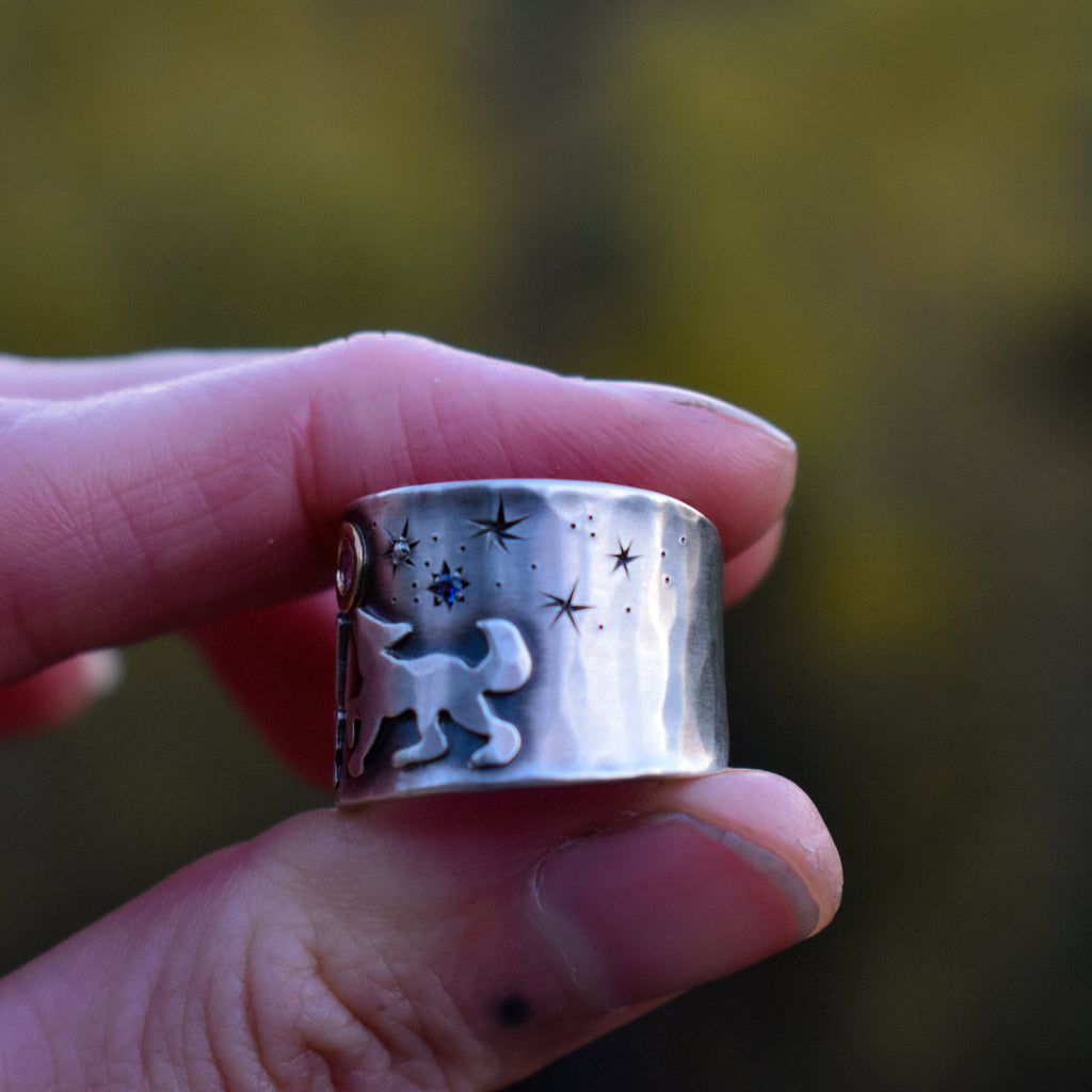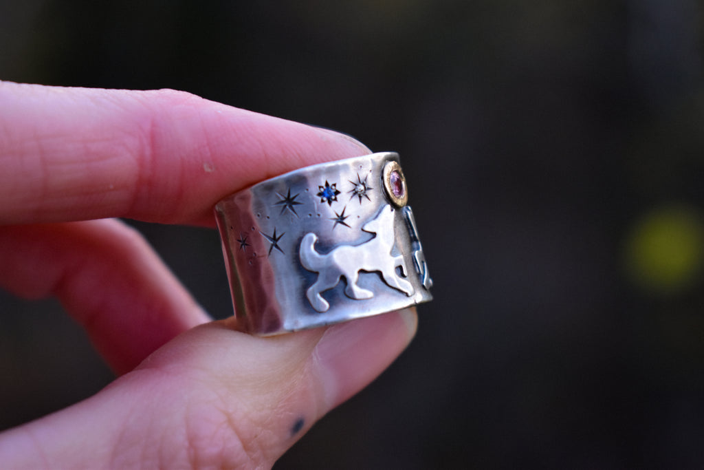 La Loba Ring 2.0 - an updated edit. I hand-forged the ring from heavy silver ingot. I wanted the hand-drawn and hand-sawn wolf sisters to have a more folksy appearance, with postures that are playful & joyful. The vibrant, deep pink sapphire symbolizes the pink harvest moon, encircled with gold wire that I drew down myself from recycled 14 karat gold ingot. It is AA grade and measures 3mm in diameter. Hand-engraved stars and star-set blue sapphires take this design to the next level. The blue sapphires are AAA grade and measure 1.5mm each. Deeply evocative and built to last using traditional hand-fabrication techniques. Oxidized satin finish for an old world feel. This ring measures size 8 on a ring mandrel, but due to its wide band and thick build, will best fit a finger size 7 or 7.5, depending on your preference for fit. Measures approx. 16mm wide at the front, tapers slightly to 11mm at the back.