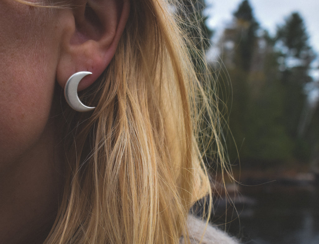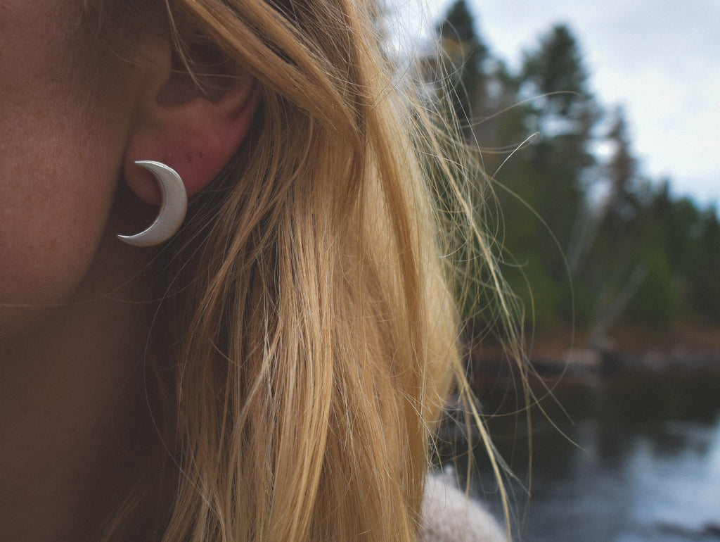 My new dailies! Hand-carved crescent moons, the ancient symbol of the divine feminine. In this new iteration, I've supersized the moons, and whereas the original design is intended to be worn as horn moons (with the two points of the crescent facing upward), these larger moons are intended to be worn vertically. They come with big silicon ear nuts as well as heavyweight sterling silver ear nuts.