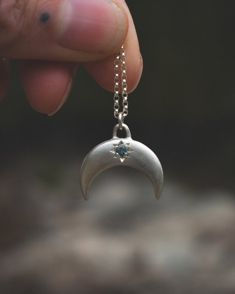 This Lunula Necklace is one of a kind, with a natural blue Montana sapphire star set in the centre. The sapphire measures approx 2.75mm in diameter. I love the subtle feminine power here. Can be worn at 18 or 20 inches. On 1.5mm sterling silver oval rolo chain and finished with a hand-forged hook clasp.
