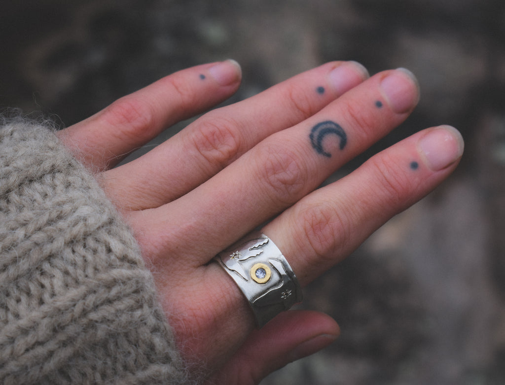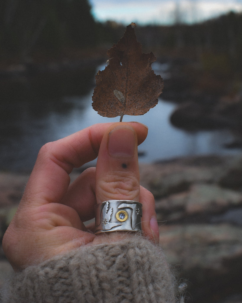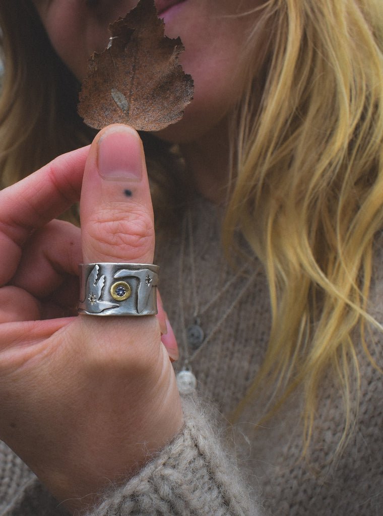 Migration Ring 2.0 - an updated edit. I hand-forged the ring from heavy silver ingot. A pair of wild geese fly across the silver, punctuated by a full moon, symbolized by a magical no treatment lavender-blue sapphire that's encircled with gold wire that I drew down myself from recycled 14 karat gold ingot. It is AA grade and measures approx 2.75mm in diameter. Star-set champagne diamonds on the geese take this design to the next level. The diamonds are from the Ekati mine in NWT, Canada, and measure 1.5mm each. Deeply evocative and built to last using traditional hand-fabrication techniques. Oxidized satin finish for an old world feel. This ring measures size 9 on a ring mandrel, but due to its wide band and thick build, will best fit a finger size 8 or 8.5, depending on your preference for fit. Measures approx. 14mm wide.
