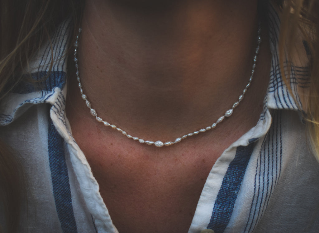 A perfect pearl strand, worn as a choker, with heavily textured, natural freshwater pearls that graduate from small to large and back again to create a pattern that pulls the eye in. I hand-knotted these vintage Japanese pearls on ecru silk according to tradition. The strand measures approx 16 inches from end to end, finished with a hand-forged sterling silver hook clasp.