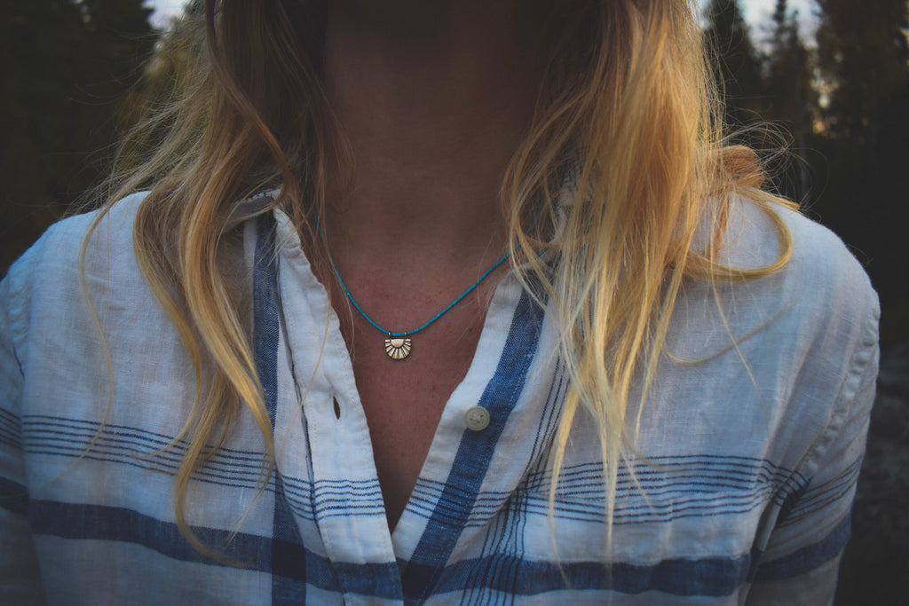 My solar power series strikes again! A tiny, retro/deco inspired sunset is strung on a strand of high grade, vibrant blue turquoise cylinders, inspired by ancient beadwork. Measures approx 17 inches from end to end, finished with a hand-forged clasp. Both the pendant and the findings are entirely handcrafted from recycled 14k yellow gold. Happy to make for you in rose gold, as well. Please leave a note at checkout or send me an email with your request. This necklace always puts the Gordon Lightfoot song "Sundown" in my head ;)