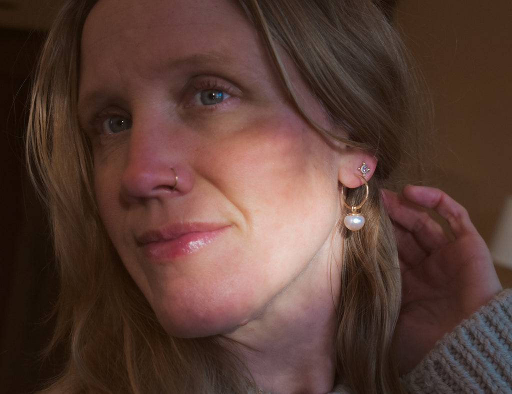 Some all time faves right here!!! Fairy bells made from natural pearls and reclaimed 10 karat yellow gold. Big beautiful button pearls in a soft peachy pearly creamy white. They dangle from hand-fabricated end caps that I forged in a quatrefoil botanical shape and finished with delicate hand-engraving for a little extra sparkle. I hand made the hoops from scratch as well! They measure approximately 7/8" or just over 20mm in diameter. Wear the hoops with or without the pearl dangles, or dangle other hoop charms from them.