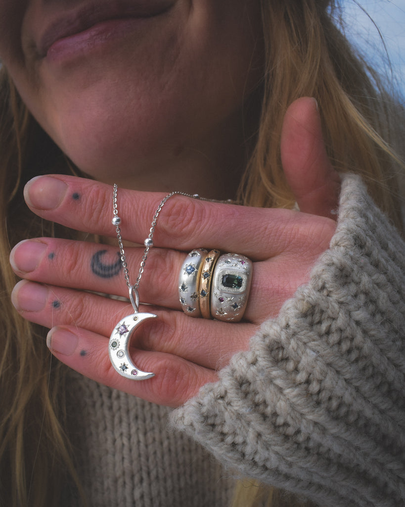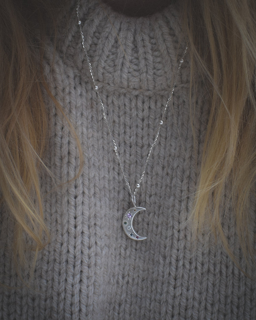 A beautifully chunky, rounded, hand-carved crescent moon charm, ornamented with six gemstones in an array of hues and settings. Recycled sterling silver set with all fair trade certified, known origin gems, including (top to bottom):